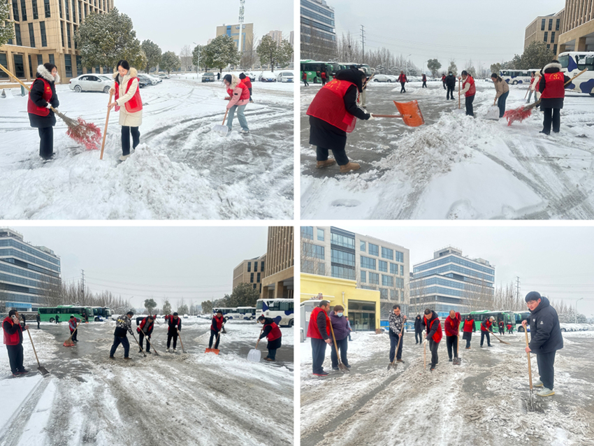 清晨寒風(fēng)刺骨,但現(xiàn)場(chǎng)干勁如火。大家身著醒目的紅色志愿馬甲,在皚皚白雪中迅速集結(jié),分成三個(gè)小組高效投入清雪作業(yè):一組負(fù)責(zé)集團(tuán)大樓正門(mén)前區(qū)域,他們揮動(dòng)鐵鍬,一鍬接一鍬奮力破除凍結(jié)的冰層;第二組沿主干道左側(cè)推進(jìn),他們手持掃帚與鏟子,細(xì)致清掃積雪、疏通通道;第三組則專注右側(cè)區(qū)域,他們默契配合,有人撒布融雪劑、有人鏟雪、有人及時(shí)掃雪,確保臺(tái)階和坡道防滑安全。沒(méi)有雪板,就用鐵鍬推、用掃帚攏;冰層太硬,就輪番上陣、接力攻堅(jiān)。盡管寒風(fēng)凜冽、鞋襪濕透、雙手凍得通紅,卻無(wú)一人退縮。鐵鍬撞擊地面的鏗鏘聲、掃帚劃過(guò)雪面的沙沙聲,匯聚成冬日里溫暖有力的奮進(jìn)旋律。